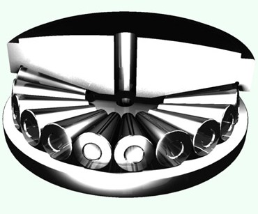 该轴承无保持架,整个滚道充满滚子,能承受较大轴向负荷,该轴承顶圈底面加工成凸球面,在压下机构相对轴承轴线产生一定倾斜时能保证轴承受力均匀。